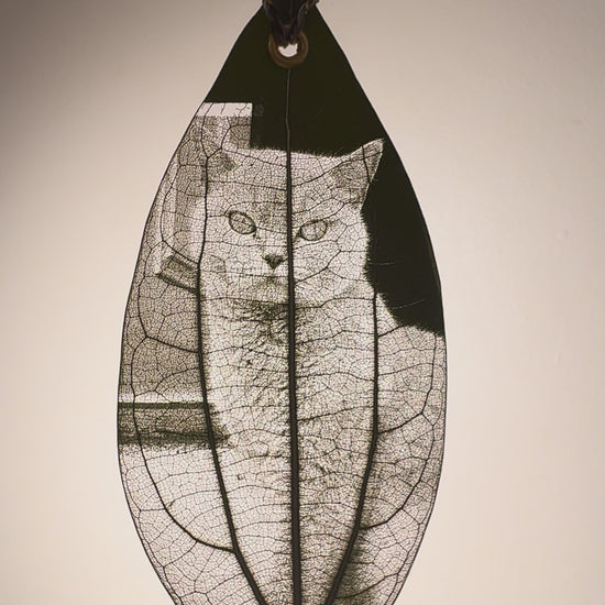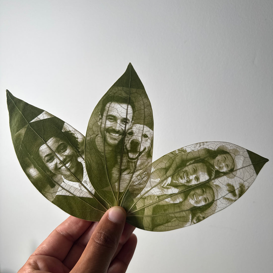 Images laser-engraved onto dried natural leaves.